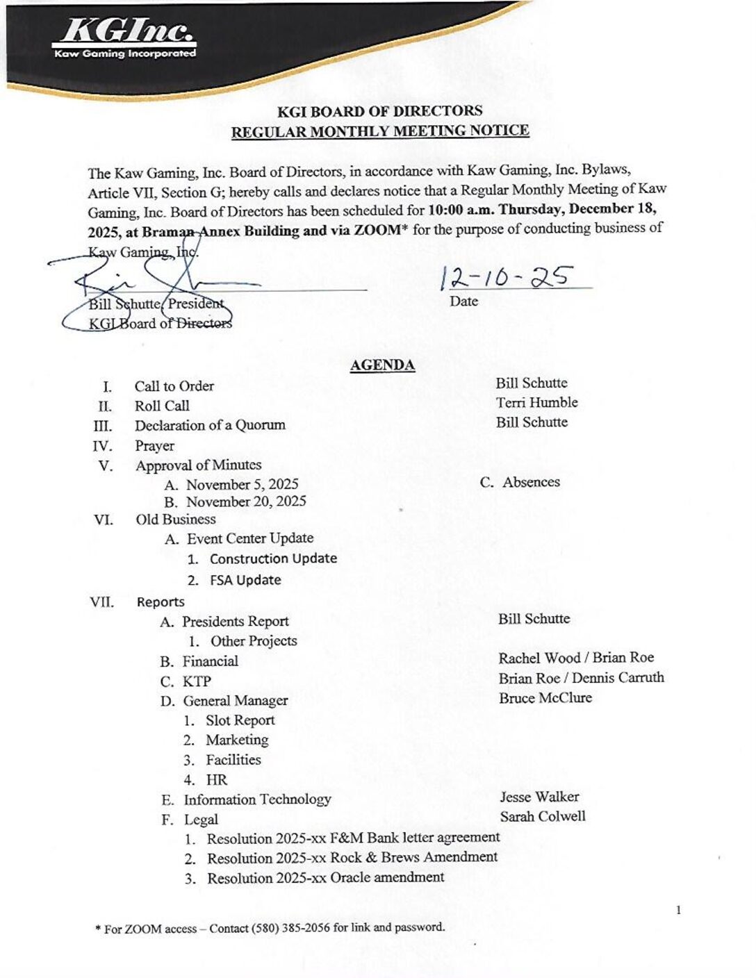 Kaw Gaming Inc. Regular Monthly Meeting December 18 2025